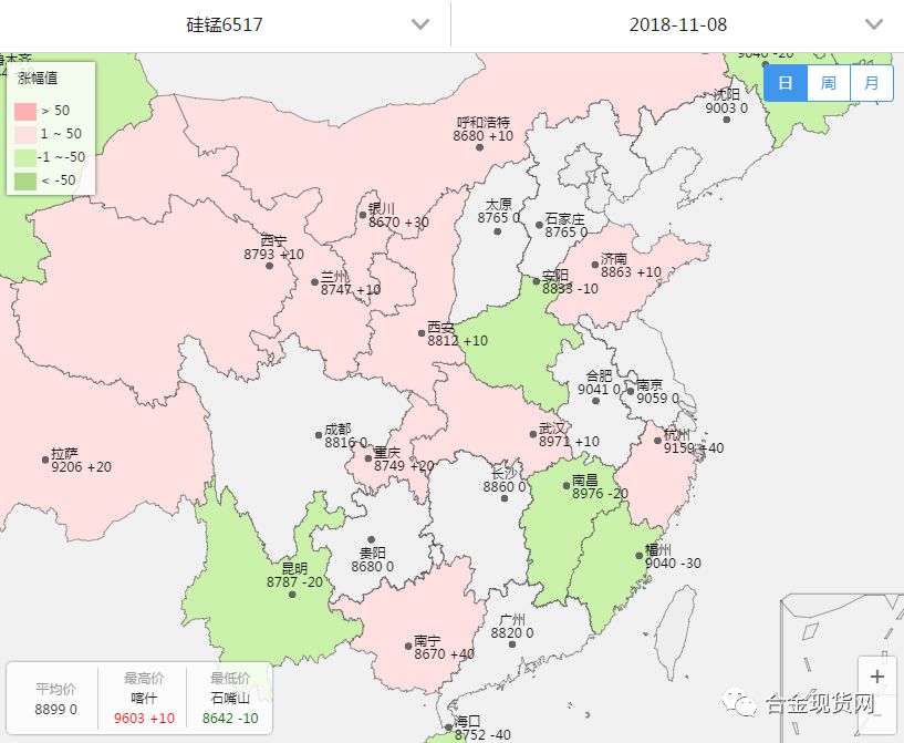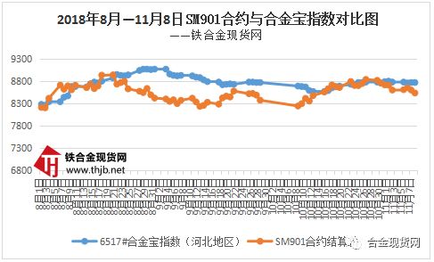 主流钢厂招标暂告一段落后,大部分工厂多以执行订单生产为主,在没有库存压力的情况下,硅锰现货市价始终处于高位盘稳胶着态势。本网站相关人员早间询盘了解,厂家报价相对集中在8600元/吨上下,且南方市场除个别高价仍存外,报盘以8500—8550元/吨附近居多。合金宝指数显示,11月8日硅锰6517#价格相较上一个交易日来看继续稳挺推进,其中,河南、河北、山东、江苏等地现金含税包到价格在8765—9059元/吨(含运费),具体如下: