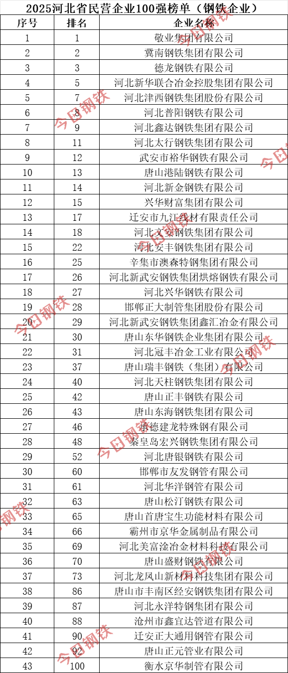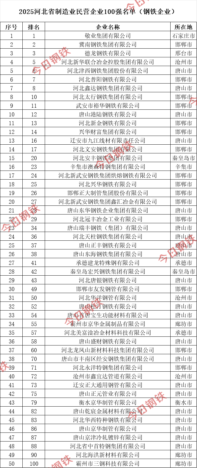 据【今日钢铁】不完全统计,有43家钢企上榜2025河北省民营企业100强,有50家钢企上榜2025河北省制造业民营企业100强。具体情况如下: 2025河北省民营企业100强 (钢铁企业) 2025河北省制造业民营企业100强 (钢铁企业) 据2025河北省民营企业100强、2025制造业民营企业100强榜单显示,有10家钢企在两类榜单的钢企细分排名中均位列前十,成为公认的河北省十大民营钢企。 分别是:敬业集团有限公司、冀南钢铁集团有限公司、德龙钢铁有限公司、河北新华联合冶金控股集团有限公司、河北津西钢铁集团股份有限公司、河北普阳钢铁有限公司、河北鑫达钢铁集团有限公司、河北太行钢铁集团有限公司、武安市裕华钢铁有限公司、唐山港陆钢铁有限公司。 此次上榜充分彰显了河北民营钢企在全省经济格局中的重要地位,这些企业凭借强大的实力与市场竞争力,不仅是钢铁行业的中坚力量,更是推动河北经济高质量发展的关键引擎。期待这些上榜钢企能继续发挥引领示范作用,持续创新突破。在产业升级、绿色发展等方面取得更大成就,为河北经济腾飞贡献更多力量,共同推动河北钢铁产业迈向新高度。