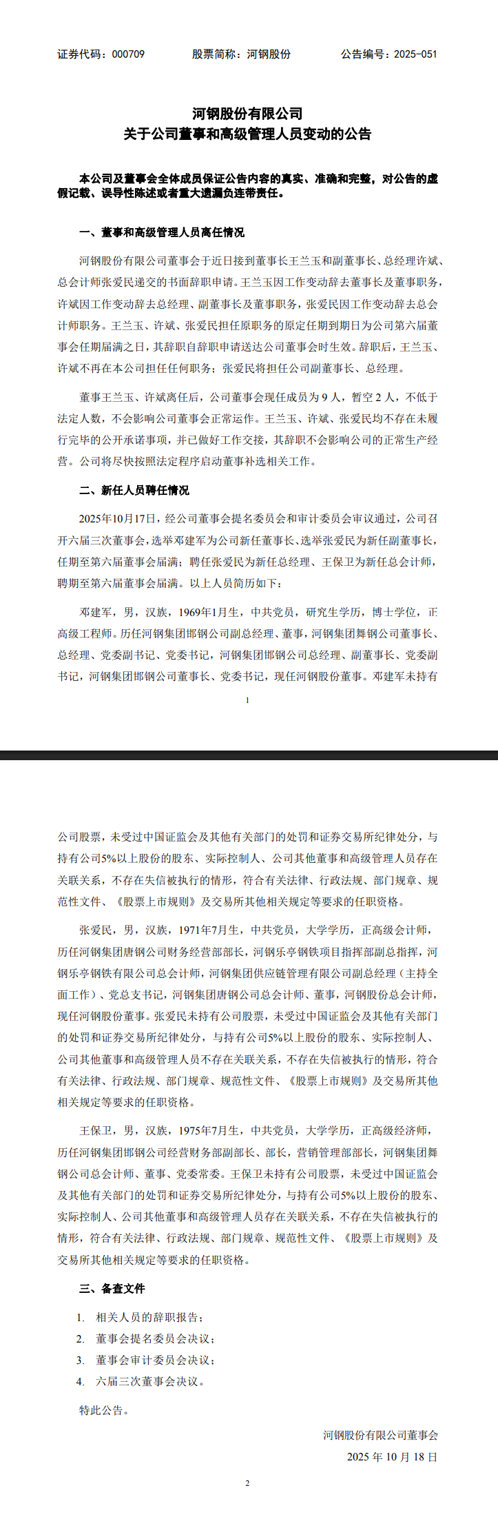 日前,河钢股份有限公司发布“关于公司董事和高级管理人员变动的公告”称,经公司董事会提名委员会和审计委员会审议通过,公司召开六届三次董事会,选举邓建军为公司新任董事长、选举张爱民为新任副董事长,任期至第六届董事会届满。