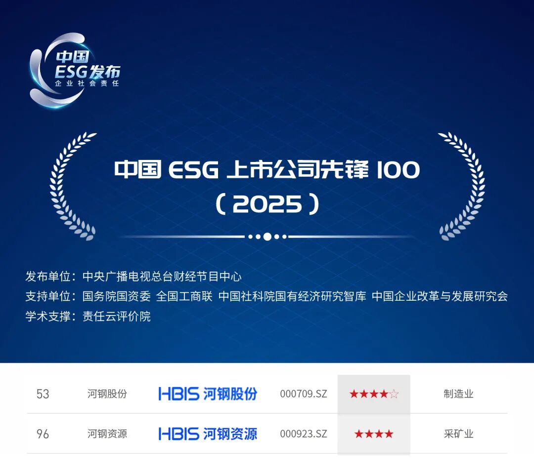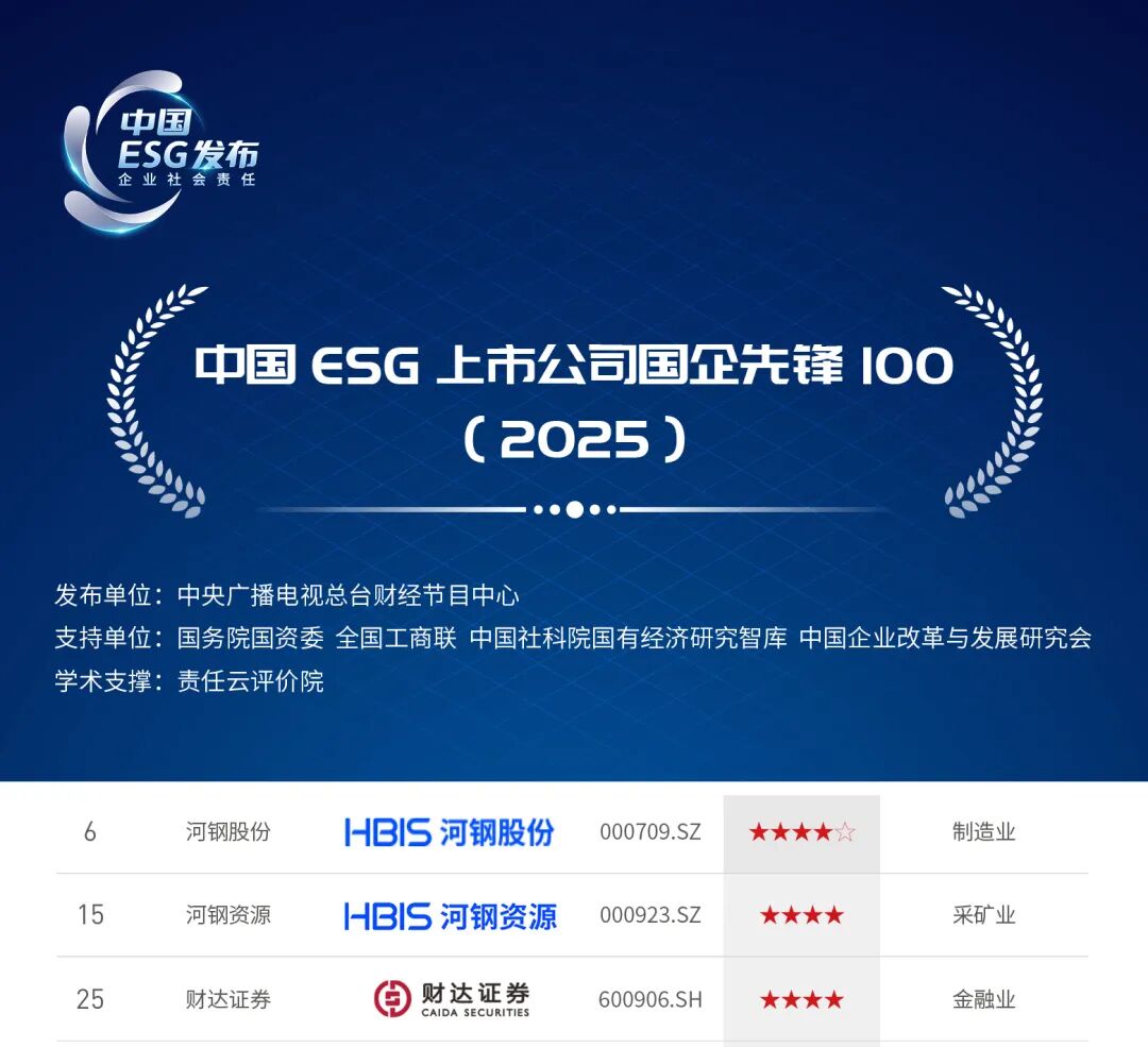 10月24日,ESG中国·创新年会(2025)在北京举办,论坛发布了《2025年度ESG行动报告》和“中国ESG上市公司先锋100(2025)”“中国ESG上市公司国企先锋100(2025)”榜单。 凭借ESG方面杰出表现,河钢三家上市公司均上榜,其中:河钢股份、河钢资源蝉联“中国ESG上市公司先锋100(2025)”榜单,分别位列第53位和96位。河钢股份、河钢资源、财达证券入选“中国ESG上市公司国企先锋100(2025)”榜单,分别位列第6位、15位和25位。 近年来,河钢集团积极推动控股上市公司践行ESG理念,高标准落实环境管理要求、积极履行社会责任、健全完善公司治理,加强高水平ESG信息披露,不断提高ESG治理能力和绩效水平,增强在资本市场的价值认同。 河钢股份以ESG为战略支点,在治理革新、绿色技术、人才培育与社会责任等维度全面发力。公司积极打造唐钢新区、邯钢新区等绿色生产基地,大力开发绿钢产品,以“极致能效”推动能效标杆示范厂培育。大力推进“钢铁智造”,树立钢铁行业“智改数转”的新标杆,为钢铁行业高质量发展作出了应有贡献。获评中国上市公司协会“可持续发展最佳实践案例”,蝉联“中国ESG上市公司京津冀先锋50”榜单。 河钢资源将ESG理念全方位嵌入运营管理全链条,多维度打造高质量发展样板。治理层面,设立董事会领导的ESG委员会,连续5年发布ESG报告,信息披露连续4年获深交所A级评价。环境层面,深耕生物多样性保护,构建野生动物种群监测、栖息地修复、物种精细化管理的全链条保护体系,实现产业与自然和谐共生。社会层面,全方位保障员工权益与薪资待遇,旗下PMC公司获评“南非2024年度最佳雇主”,员工持股计划获南非总统颁奖;通过援建医疗中心、助学等举措惠及多个社区。获评华证指数AA评级,蝉联“中国ESG上市公司京津冀先锋50”榜单。 财达证券积极践行ESG发展理念,深度融入战略决策与运营管理,持续完善治理体系,提升信息披露质量。深入绿色金融领域布局,以实际行动推进绿色金融市场建设,自营业务获准参与碳排放权交易,成为践行绿色金融的又一重要里程碑。切实履行“金融为民”职责,2024年服务投资者157.9万人次。多次荣获中国上市公司协会“董事会优秀实践案例”“可持续发展优秀实践案例”,蝉联“中国ESG上市公司京津冀先锋50”榜单。