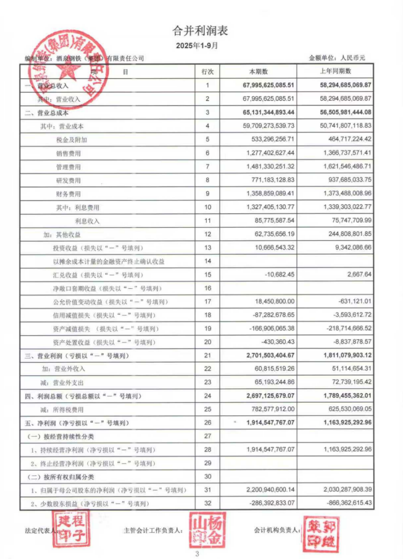 01中国宝武钢铁集团有限公司 营收5656.86亿,净利润138.40亿 据中国宝武钢铁集团有限公司2025年1-9月合并利润表显示,2025年前9月,中国宝武钢铁集团有限公司实现营业总收入565,685,683,232.26元,较去年同期的697,538,652,237.90减少;实现净利润13,839,768,948.79元,较去年同期的10,454,457,239.90元,盈利增加,净利润已超去年全年数据。(注:中国宝武钢铁集团2024年营业收入9002亿元,同比2023年下降19.12%,净利润135.67亿元,同比2023年下降43%。 02湖南钢铁集团 营收1918.03亿,净利润59.13亿 据湖南钢铁集团有限公司2025年1-9月合并利润表显示,2025年前9月,湖南钢铁集团有限公司实现营业总收入191,802,644,798.71元,较去年同期的164,167,201,144.45增加;实现净利润5,913,153,783.14元,较去年同期的5,824,787,190.22元,盈利增加。 03首钢集团 营收1552.65亿,净利润29.79亿 首钢集团有限公司2025年前三季度合并利润表显示,2025年前三季度,首钢集团实现营业收入155,264,992,885.15元,与去年同期的174,563,197,596.27元减少,实现净利润2,978,647,283.86,与去年同期的2,534,612,225.41元相比,盈利增加。 04包头钢铁(集团)有限责任公司 营收916.89亿,净利润28.29亿 包头钢铁(集团)有限责任公司合并利润表显示,2025年前9月包钢集团实现营业总收入91,689,168,540.74元,与去年同期的77,260,693,239.58元相比增加,实现净利润2,829,408,899.98元,与去年同期的2,087,385,281.01元相比,盈利大幅增加。 05河钢集团有限公司 营收3103.64亿,净利润26.99亿 河钢集团有限公司2025年1-9月合并利润表显示,2025年前9月,河钢集团实现营业总收入310,364,336,451.03元,与去年同期的295,147,974,307.61元相比增加,实现净利润2,698,574,694.21元,较去年同期的1,821,347,471.28元,盈利大幅增加。 06江苏沙钢集团有限公司 营收1377.06亿,净利润21.66亿 江苏沙钢集团有限公司2025年1-9月合并利润表显示,2025年前9月,江苏沙钢集团有限公司营业收入合计137,706,220,905.58元,较去年同期的115,935,419,086.37元增加;实现净利润2,165,867,222.71元,较去年同期的936,873,168.03元,盈利明显增加。 07酒泉钢铁(集团)有限责任公司 营收679.96亿,净利润19.15亿 酒泉钢铁(集团)有限责任公司2025年1-9月合并利润表显示,2025年前9月,酒泉钢铁(集团)有限责任公司实现营业总收入67,995,625,085.51元,与去年同期的58,294,685,069.87元相比增加,实现净利润1,914,547,767.07元,较去年同期的1,163,925,292.96元,盈利大幅增加。 08杭州钢铁集团有限公司 营收2117.61亿,净利润11.57亿 杭州钢铁集团有限公司(企业合并)利润表显示,截至2025年前9月本年营业总收入累计数为211,760,566,580.32元,较上年同期数217,547,851,074.09元减少,实现净利润1,157,106,573.53元,较上年同期772,219,654.98元,盈利增加。 09广西柳州钢铁集团有限公司 营收763.73亿,净利润2.65亿 据广西柳州钢铁集团有限公司2025年1-9月合并利润表显示,2025年前9月,广西柳州钢铁集团有限公司实现营业总收入76,372,514,938.21元,较去年同期的72,598,582,894.37增加;实现净利润264,786,999.00元,较去年同期的-3,004,971,142.14元,同比实现扭亏为盈,盈利大幅增加。 10安阳钢铁集团有限责任公司 营收246.92亿,净利润2.41亿 安阳钢铁集团有限责任公司合并及公司利润表显示,2025年前三季度安钢集团实现合并营业总收入24,691,907,961.48元,与去年同期的26,401,746,796.31元相比减少,实现合并净利润240,618,930.90元,与去年同期的-2,173,397,333.78元相比,实现扭亏为盈,盈利大幅增加。 看到这里,肯定有人要问了,2025年钢价持续低迷,为何这10家钢铁集团仍然能实现大赚呢?背后是何原因呢?我们一起来看! 01今年成本下降更为明显 从逻辑上来讲,钢厂的盈利,不取决于钢价的“绝对高低”,而取决于钢价与成本的“价差大小”。当成本跌得比成品还狠时,利润空间就被“挤”出来了。今年焦炭曾经连降8轮,铁矿石价格较将去年回落,原料价格下降,对钢价支撑减弱,同时也给钢厂提供了更大的利润空间。 报告中多家钢企在营收微增甚至下降的情况下,净利润却大幅攀升。这恰恰说明,利润并非来自“多卖货”,而是来自“更会算账”。 02产品结构悄然巨变 以扭亏为盈的两家钢企为例: 柳钢集团从根本上改变其产业构成,从过去建筑钢材占比70%,转变为制造业用钢占比70%,同时柳钢集团全力发展“四个百万吨”高端产品集群,例如汽车用钢和新能源用钢,推动品种钢比例提升至42.3%以上,其中部分产品的销量同比增长甚至超过160%。 安阳钢铁集团核心策略是向“特钢”领域转型,公司持续深化安阳基地的“五大特钢”等特色产品布局,通过提升高附加值特钢产品的产销量占比,来带动整体效益的改善。 03极限降本和数字革命 外部环境不可控,但内部挖潜却是无穷的。十大盈利的钢铁集团背后,大多是通过极致的成本管控和深度的数字化、智能化转型,才得以实现利润的大幅提升。 宝武集团全面推动智能化升级,应用视频AI识别算法和高精度相机深度学习,实现操作自动化,自主研发“钢铁大模型”,实现105个典型场景深度应用,直接提升产品质量和生产效率,“智慧排程”模型在单个基地预计每年可增加效益超亿元。 河钢集团石钢公司转型为绿色短流程特钢智能工厂,实现从废钢到成品的全流程智能制造;唐钢新区通过动态调度模型根据电价峰谷调节发电节奏,每年节约电费超千万元。