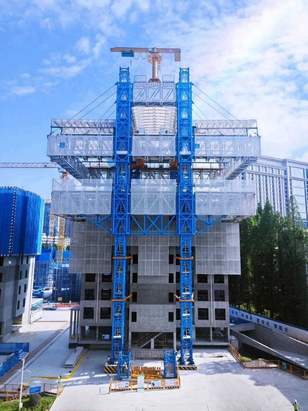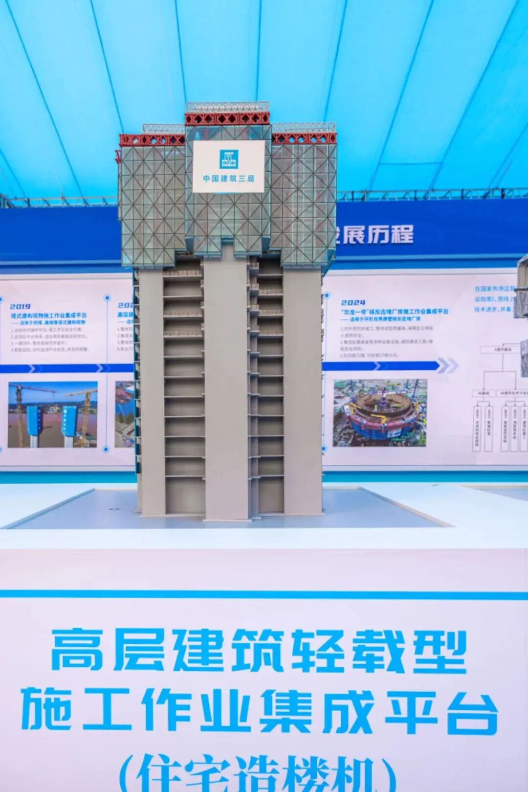“ 在施工作业平台领域,针对传统模架施工存在的机械自动化程度低、高处作业风险大、高坠与坍塌事故频发等痛点,中建三局对施工作业集成平台进行了系列化研发,力求打造一个安全舒适的高空作业环境。 经过多次迭代升级,目前已覆盖从千米级摩天大楼到普通高层住宅、从桥塔高墩到核电反应堆厂房等多建造领域的全系列产品。 01、空中造楼机 (适用于300米以上超高层建筑) 1、抗风。轻松抵御14级大风; 2、稳定性好。承载力和刚度是传统施工平台3倍以上; 3、防坠。采用自翻转挂爪和多排挂靴; 4、适应性强。避免高空拆改,灵活适应核心筒墙体内收外扩; 5、智能监控。搭载全方位超限预警功能。 北京中信大厦:528米 深圳城脉金融中心大厦:388米 02、住宅造楼机 (适用于300米以下高层建筑) 1、整体性好,施工作业防护全封闭,架体和模板整体吊挂、同步提升; 2、全天候作业工厂,集成布料机、喷淋养护、材料转运、水电控制、防护雨棚、照明、厕所等。 武汉硚口易家墩项目:131米 成都中建天府公馆:98米 03、装配式造楼机 (适用于装配式建筑) 91%装配率 1、地面安装搭设,杜绝高空安拆风险,可降至地面解体; 2、一键顶升下降,提供外立面工序穿插作业防护,可替代吊篮和屋面悬挑脚手架完成外立面和屋面施工; 3、智能吊装,实现少人化作业。搭载智能行车及数据驱动系统、智能巡检机器人,可减少作业人员和管理人员数量。 04、造塔机 (适用于桥塔高墩施工) 1、整体稳定性好:抗风能力强,承载力高,整体框架可同步顶升; 2、工效高,减少高空作业暴露时间,采用双模板循环施工,工效提高40%; 3、自适应强,独创弧形角模与承力件,适应连续变化的塔柱截面; 4、智能化高,搭载综合监控系统,一键顶升,实时监测平台状态进行预警。 亚洲第三高墩——渝湘复线重庆芦沟河特大桥 05、核岛施工平台 (适用于华龙一号反应堆厂房施工) 1、内外壳同步施工,整体成型质量高,保障反应堆投入使用安全; 2、抗风能力强,可抵御17级台风; 3、多功能全阶段服务,营造安全舒适环境。集成起重装备、安全设备、功能库房等多种设施,缩短建造周期,降低安全生产风险。 05华龙一号反应堆厂房施工作业集成平台 “ 核心施工装备展示。为实现塔机本质安全,杜绝起重吊装事故,中建三局在塔机安拆、吊装作业方面做了大量研发工作,实现了突破性的成果。 06、塔机智能集控系统 (塔机操作方面) 1、地面室内远程操作。通过地面端操作台远程指令实施操作现场塔机,从根本上改变塔司作业环境; 2、可视化吊装无死角。通过全方位摄像头和信息数据展示,提高了吊装安全和效率; 3、防碰撞。建立塔机及周边工作环境的三维模型及监控系统,实现塔机碰撞信息的智能实时监控,确保群塔作业安全; 4、少人化作业。通过合理分配塔司吊装任务,单人操作多台塔机,有效减少了人员投入; 07、安全塔机 (塔机安拆方面) 1、顶部加节,保障顶升安全; 2、一键顶升,减少作业人员; 3、一键下降,避开大风风险。 08、可变角度斜附式塔机 (斜塔施工装备方面) 1、吊装能力强。塔头距作业区域的工作半径可始终保持最优; 2、稳定性好。附着较短且标准化程度高,能够有效降低大风等不利天气的影响; 3、一键变形。搭载智能同步控制系统,变形过程安全可靠。 “ 保障人身安全方面的部分研发成果。 09、零海拔屋 (高海拔和极地人居方面) 南极昆仑站-极地增压建筑 新疆慕士塔格-天文观察站 1、改善高原居住环境。将高原室内环境指标调节至平原水平; 2、应急预警设施齐全。采用了增压建筑逃生门窗、紧急泄压系统和能在增压环境中自动响应的火灾报警与灭火系统; 3、保障人体生理安全。研发团队自2022年起开展生理健康实验,通过深入研究和测试进藏人群以及当地居民的生理反应,有效验证了“零海拔屋”对于进藏人群身体健康的积极促进效果。 西藏军区-零海拔营房 珠峰大本营-增压补氧保障中心 10、磁力缓降逃生设备 (高层消防逃生方面) 1、无需电源,稳定逃生。借助高强永磁铁实现人员匀速下降; 2、不受高度限制; 3、可作为永久消防设施,具备实体应用前景。 11、智能安全帽 (施工人员防护方面) 1、实时定位。精确确定人员在楼栋、楼层的位置; 2、轨迹跟踪。全天候记录人员轨迹; 3、风险预警。人员靠近危险源区域时,主动发出语音预警; 4、紧急呼救。紧急情况可按下SOS紧急呼救按钮。