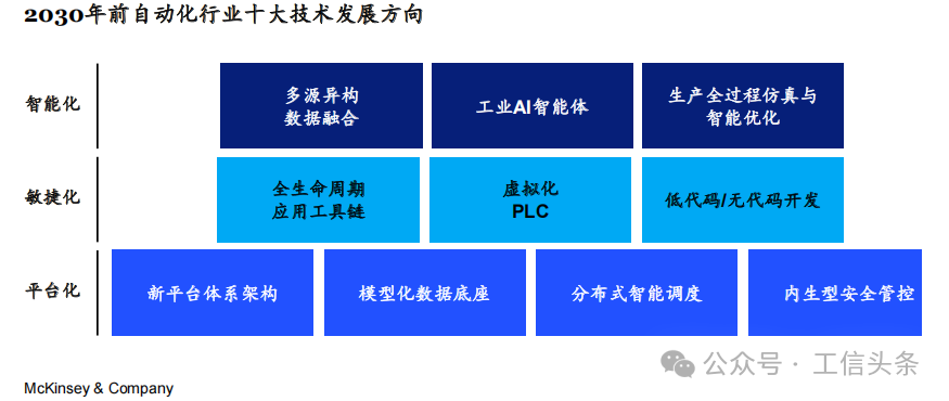 近日,麦肯锡发布《融合生态 拥抱智能:2030中国智能制造及自动化行业展望》报告。报告指出,随着工业4.0和生成式AI技术的发展,全球智能制造和工业自动化行业变革加速。到2030年,中国、日韩和西欧等先进制造市场有望率先实现自动化革命。中国对智能制造和工业自动化高度重视,出台了一系列政策支持行业发展,如《“十四五”智能制造发展规划》,旨在推动制造业数字化转型、网络化协同、智能化变革。 麦肯锡估算,2025年全球工业自动化市场规模将达到约1083亿美元,中国工业自动化市场规模超过人民币2500亿元,占全球市场的三分之一以上。报告预测,未来五年中国自动化行业将实现跨越式增长,主要得益于工业自动化细分领域的增长潜力,包括连续流制造业、离散制造业和工业物联网软件及云服务。 报告强调了人工智能、虚拟PLC、数字孪生和无代码/低代码开发等关键技术对工业自动化和机器人性能的显著提升。这些技术增强了机器人的感知、决策、运动控制能力,并提高了人机交互的易用性。此外,报告还提出了“平台化、敏捷化、智能化”三大技术趋势,以及十大技术发展方向: